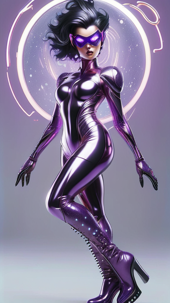 Futuristic supervillain. Cyberpunk, Scanners. Telepath, telekinetic, brain waves, mind powers. Caucasian feminine woman. Tall, thin, athletic, fit. Short length black hair with a purple Sheen, in a spiky choppy swept up and swept style, hair flipped over one eye. Beautiful pale skin with sculptured brows and opal eyes. Her eyes are hidden behind Violet colored futuristic goggles. Strong cheekbones, delicate chin. Shiny silver full bodysuit (full body coverage) with lavender tech and circuitry patterns on the arms, legs, and chest. High heeled knee-high boots with the same kinds of patterns. There is a circle of purple, Violet, lavender, pink and white sparks/energy flying forth from around her head, signifying her telepathic powers. Full body pose, she is levitating off the ground.