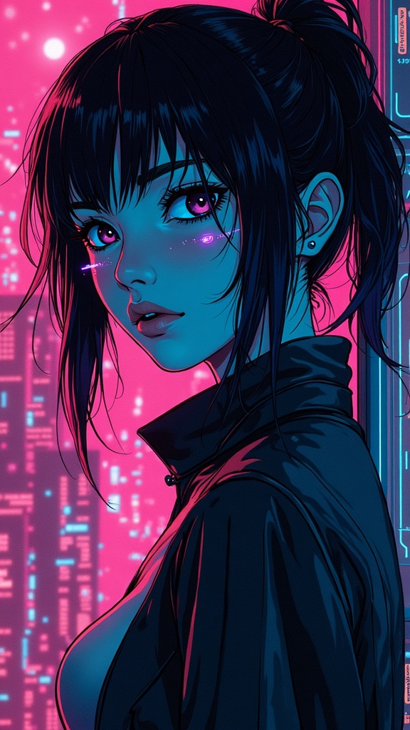 View this AI-generated image featuring futuristic techno rave beats infused with cybernetic echoes inspired by ghost in the shell s ethereal ambiance a vibrant 90s manga aesthetic showcasing bold lines and neon hues expressive faces illuminated by the glow of digital screens capturing the intensity
