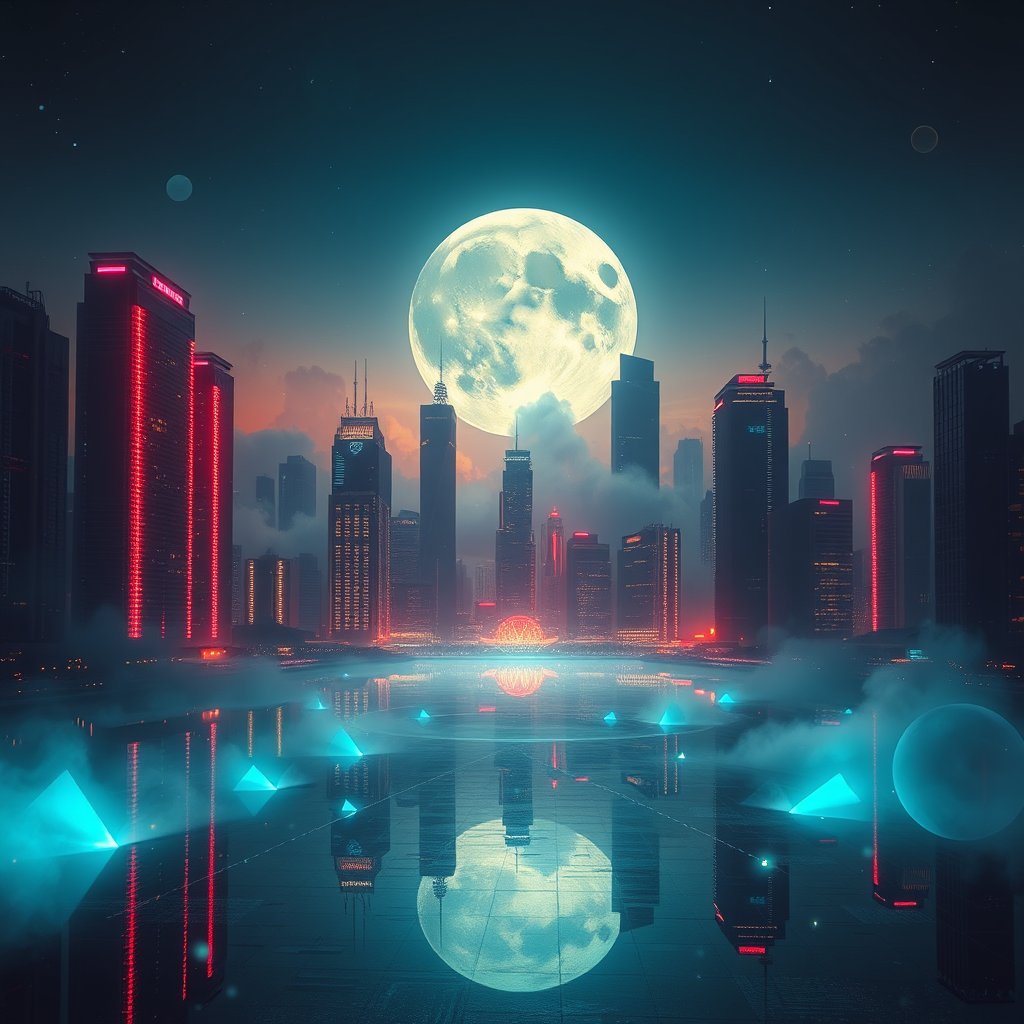 Futuristic techno dark album cover design, featuring a mesmerizing cityscape with neon-lit skyscrapers casting reflections in a vast, tranquil waterbody. A surreal, oversized moon looms low in the sky, its surface etched with intricate circuit patterns. Ethereal fog swirls around the buildings, interspersed with faint, luminescent geometric shapes, creating an atmosphere that invites deep contemplation and immersion in the music's cosmic journey.