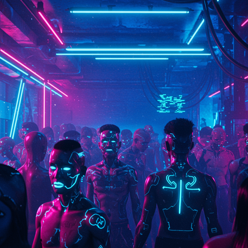 Futuristic techno rave music infused with the ethereal essence of Ghost in the Shell, reflecting a 90s manga aesthetic, featuring strikingly expressive faces in a neon-lit cybernetic landscape.