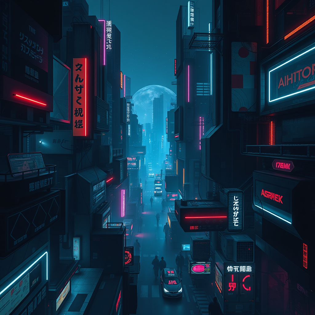 Futuristic urban nightscape fused with abstract geometrical shapes and neon accents, creating a sense of mysterious depth and intrigue, enveloped in shadowy hues and pulsating rhythms, inviting the observer to delve into an electrifying sonic experience.
