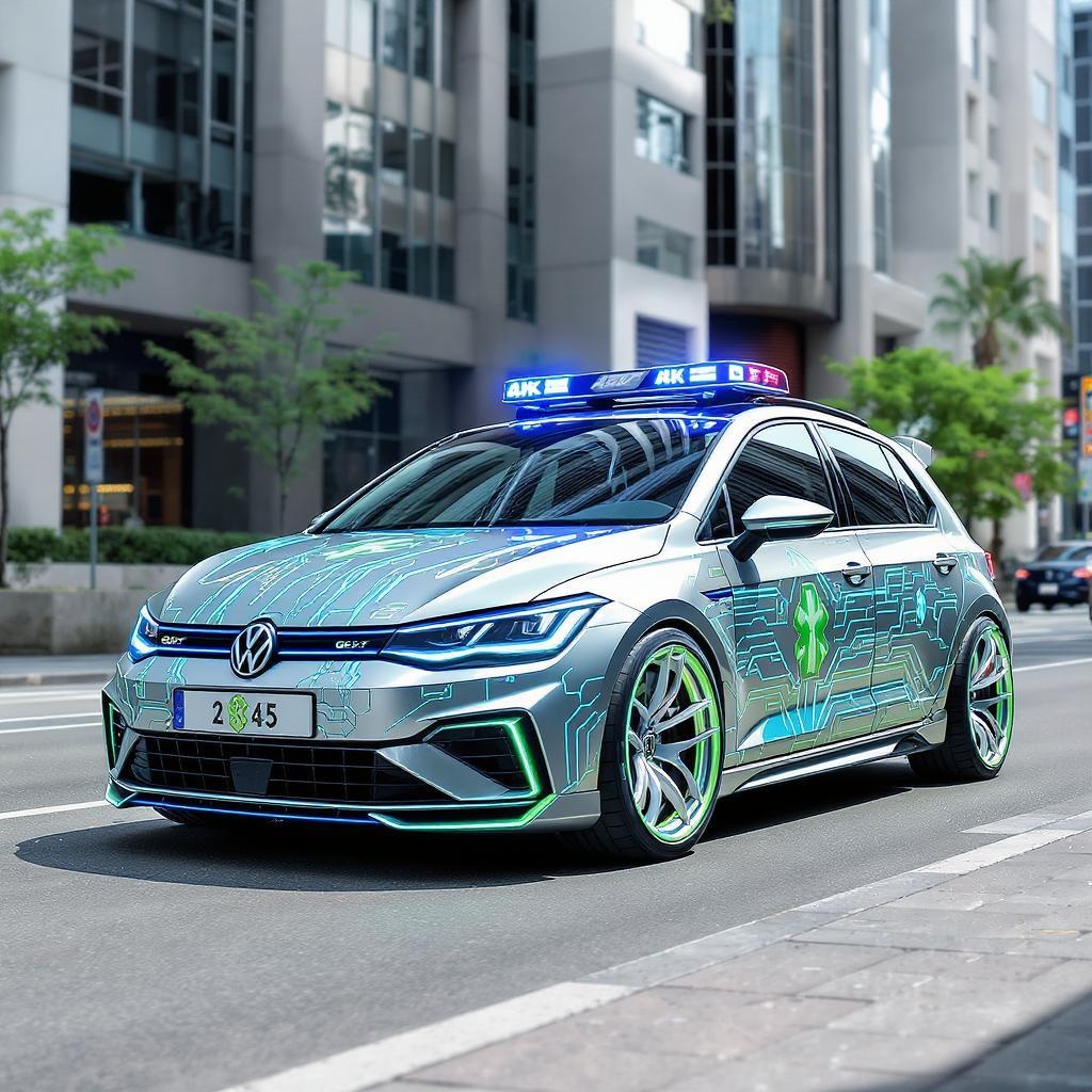 Futuristic VW Golf car designed in a robotic style with ambulance features, highlighting intricate electronic circuitry and vibrant neon accents, set in a sunlit panoramic scene. The vehicle showcases a metallic finish with meticulously detailed elements, captured in high resolution, 4k quality.