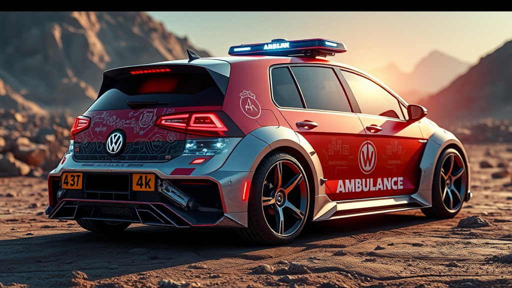 Futuristic VW Golf car in robotic design with ambulance elements, intricate electronic circuitry patterns, vibrant neon highlights, illuminated by sunlight, set in a panoramic metallic landscape, featuring highly detailed textures, high resolution, 4k quality.