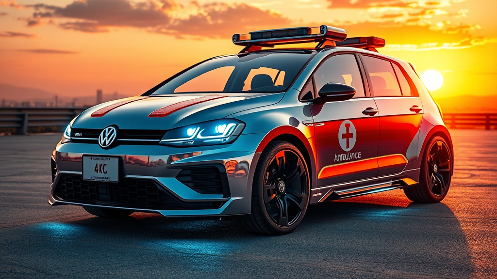 Futuristic VW Golf car reimagined in robotic style, featuring ambulance elements with glowing electronic circuitry accents, illuminated by vibrant neon reflections, and bathed in warm sunlight. Set against a panoramic backdrop, the metallic surface showcases intricate detailing, captured in high-resolution 4k.