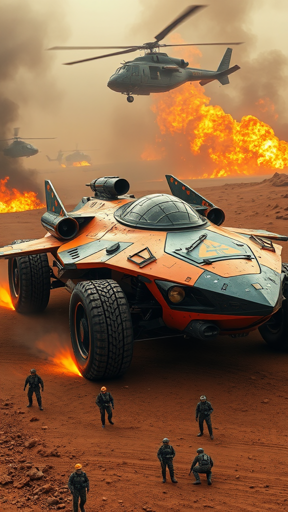Futuristic War Machine Spacecraft with Distressed Military Jet aesthetic and neon orange with metallic matte black and stark white accents, impeccable luxury design, flawless high-resolution 12k sharp focus, sweeping wide-angle panorama shot, hyper-realistic visual fidelity, Sci-Fi influenced Blade Runner meets Band of Brothers, wheels burning rubber against the scorched barren ground, extraterrestrial battlefield, ramgates of smoke and fire, heliborne assault, medevac chopper, cargo spaceship in background, politicians negotiating surrender, securing evacuation, humanitarian aid delivery, combat salvage team on hostile terrain.