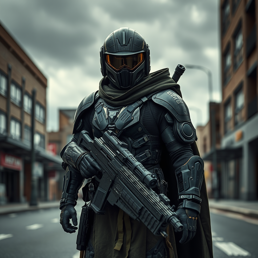 Futuristic warrior adorned in state-of-the-art armor and sophisticated weaponry, helmeted and cloaked in dark olive tones, positioned on an urban street under a brooding, cloudy sky. The scene features complex reflection mapping, showcasing a meticulous and intricate design with elaborate detailing. Dramatic lighting casts deep shadows, enhancing the hyperrealistic and photorealistic qualities of the image, reminiscent of a cinematic moment captured in 8k resolution, rendered with the visual intensity of a high-end graphics engine.