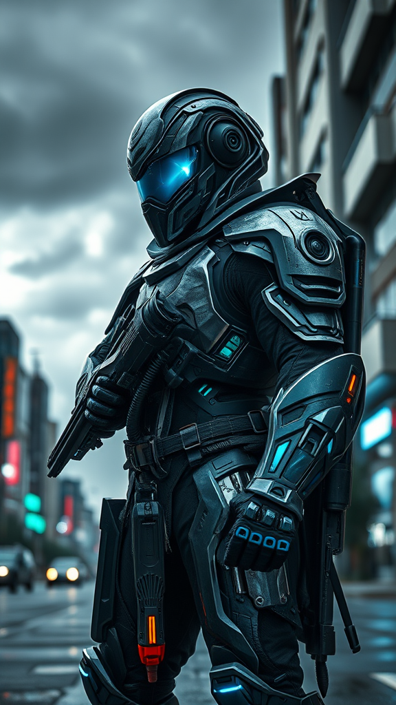 Futuristic warrior clad in advanced armor featuring intricate designs and details, equipped with cutting-edge weaponry and holographic navigation systems, standing in an urban street setting under an overcast sky. The scene exudes hyperrealism with dramatic, cinematic lighting that highlights the reflective surfaces of the armor through reflection mapping. The environment’s photorealistic textures are rendered in 8k quality, capturing every nuance with precision, as if brought to life through the Unreal Engine. The atmosphere is tense and immersive, as if pulled straight from a visionary science fiction universe.