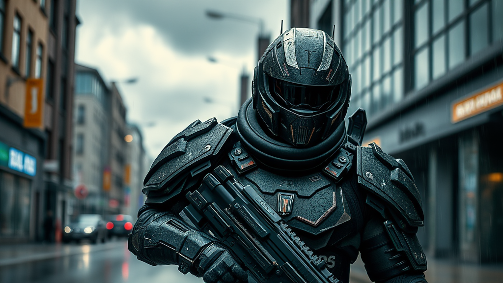 Futuristic warrior clad in cutting-edge armor and sophisticated weaponry, helmet featuring integrated technology, dressed in deep forest green, standing on a rain-soaked urban street, clouds looming overhead; surface textures detailed with reflection mapping, showcasing a complex and intricate design in dramatic, dynamic lighting, embodying a sense of hyperrealism and photorealism, presented with a cinematic flair, rendered in breathtaking 8k resolution, like a scene from an avant-garde video game engine.
