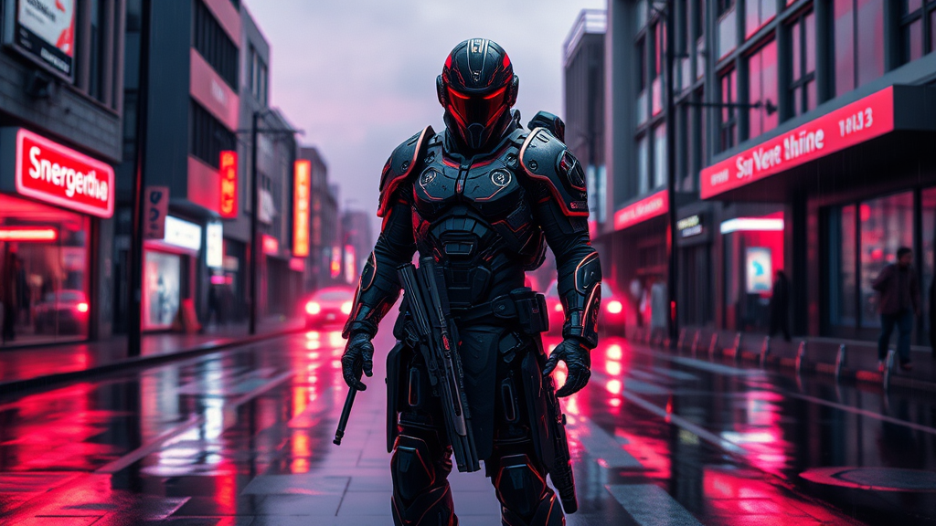 Futuristic warrior donned in ultra-modern armor, showcasing advanced weaponry and a sleek helmet, vivid neon red hues, standing on a rain-soaked street with an overcast sky overhead, reflections glistening on the wet ground, featuring complex and elaborate design elements, enhanced by dramatic and moody lighting, photorealistically rendered with hyperrealism, capturing a cinematic essence in 8k detail, resembling an artwork crafted within the Unreal Engine -- aspect ratio 9:16 -- stylized at 750.