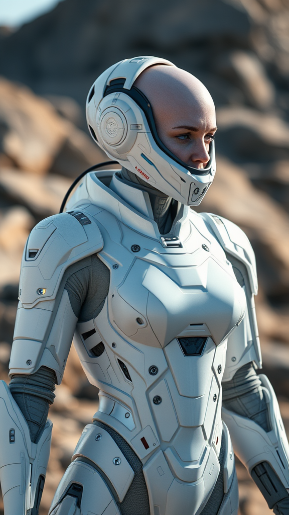 Futuristic white sci-fi female armor with an intricate cybernetic helmet, full-body and insulated design resembling a high-tech spacesuit, detailed with sleek panels and illuminated accents, the character exhibits a bald head showcasing advanced interface connections, crafted with fine detail typical of sci-fi cinema style, set outdoors in a dynamic pose, captured in natural light with photorealistic clarity, cinematic rendering enhanced by ray tracing, featuring the highest possible quality and detail, presenting a captivating third-person view.