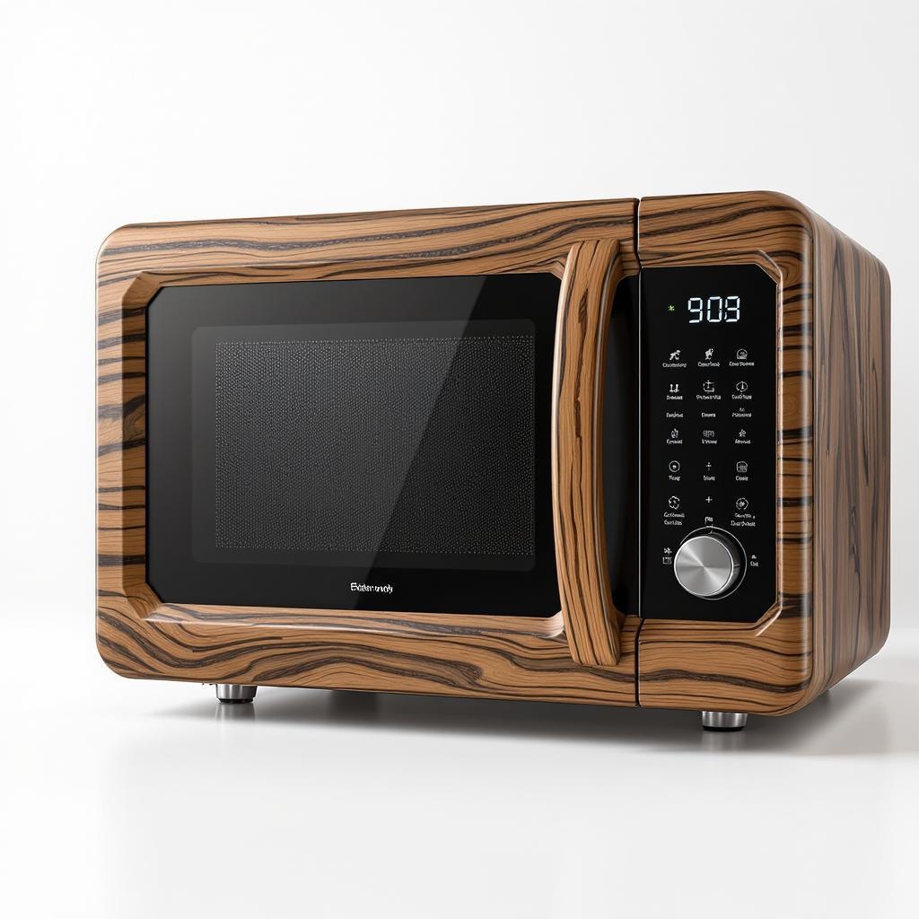 Futuristic wooden microwave, blending modern aesthetics with sustainable design; crafted from polished, eco-friendly materials. Hyper detailed and hyper realistic, capturing the essence of a stylish and innovative kitchen appliance. Rendered in the artstation style with a focus on intricate textures and patterns, set against a minimalist white background. Utilizing the power of Unreal Engine for remarkable detail and depth of field, showcasing a visionary approach to kitchen technology. Presented in 8K PNG format, with a balanced aspect ratio of 1:1, highlighting both form and function. Incorporates subtle, creative elements like seamless touch controls and a sleek, transparent display to enhance the futuristic theme.