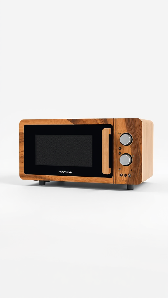 Futuristic wooden microwave, incorporating sleek modern design with sustainable materials, hyper-realistic and intricately detailed, similar to art found on ArtStation. The aesthetic merges advanced digital art techniques with the realism of Unreal Engine, set against a crisp white background, highlighting fine textures and subtle grain of the wood. Capture in ultra-high definition with an 8K resolution, using depth of field for enhanced focus and depth. Ratio --ar 1:1, with creative elements gently integrated, maintaining the core innovative concept of a high-tech, eco-friendly appliance.