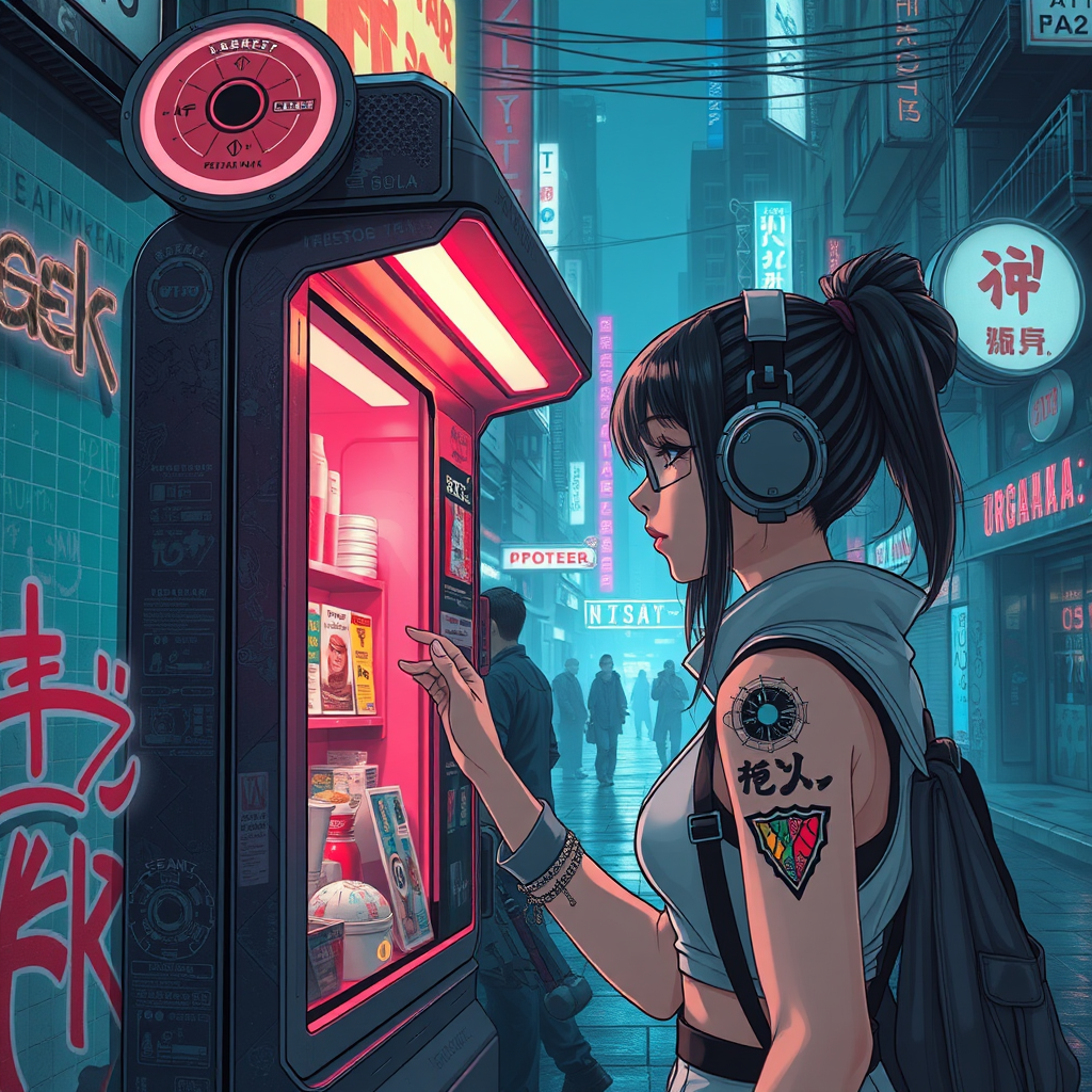 Futuristic young woman interacting with an advanced food vendor kiosk in a techno-noir city, animated manga style, neon-lit cyberpunk streets adorned with graffiti, dark and moody atmosphere, ultra-detailed cityscape, vintage futurism meets pan futurism, high-tech implants and augmented reality overlays in a dystopian setting, electronic artwork depicting an intricate urban environment filled with gadgets and cinematic details, showcasing a gritty yet vibrant urban life.