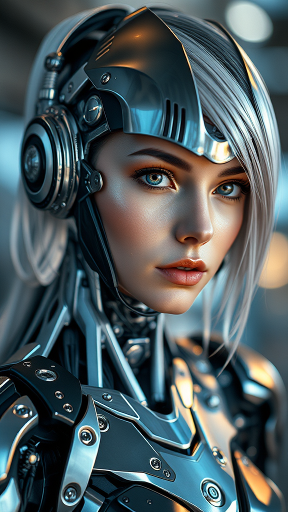 futuristic_scifi_guardian, portrait of a cybernetic female android, metallic complexion, cybernetic enhancements, shimmering armor, steel plating, chrome hair, high definition, soft focus, intricate bokeh, dynamic depth of field