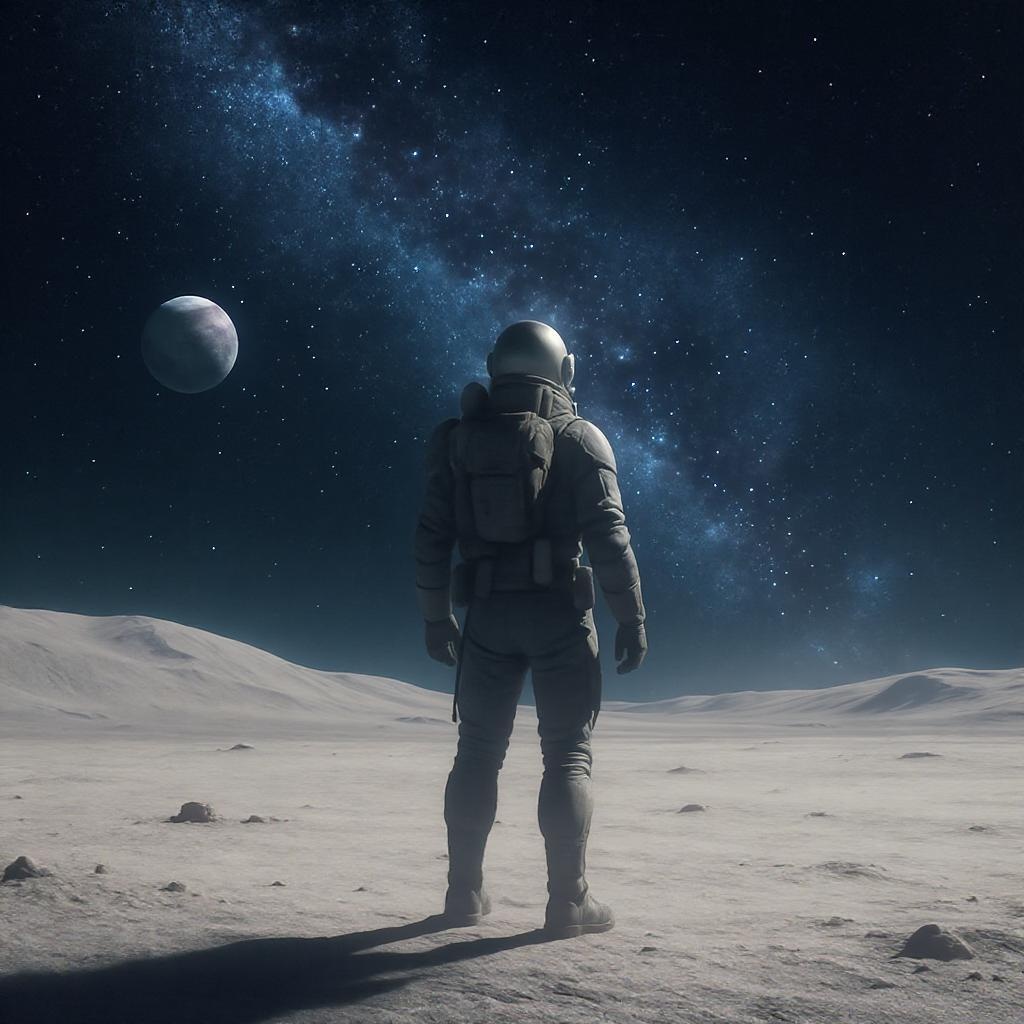 Galactic explorer, viewed from behind, captivating silhouette, standing on a soft lunar landscape, gazing into the cosmic distance.