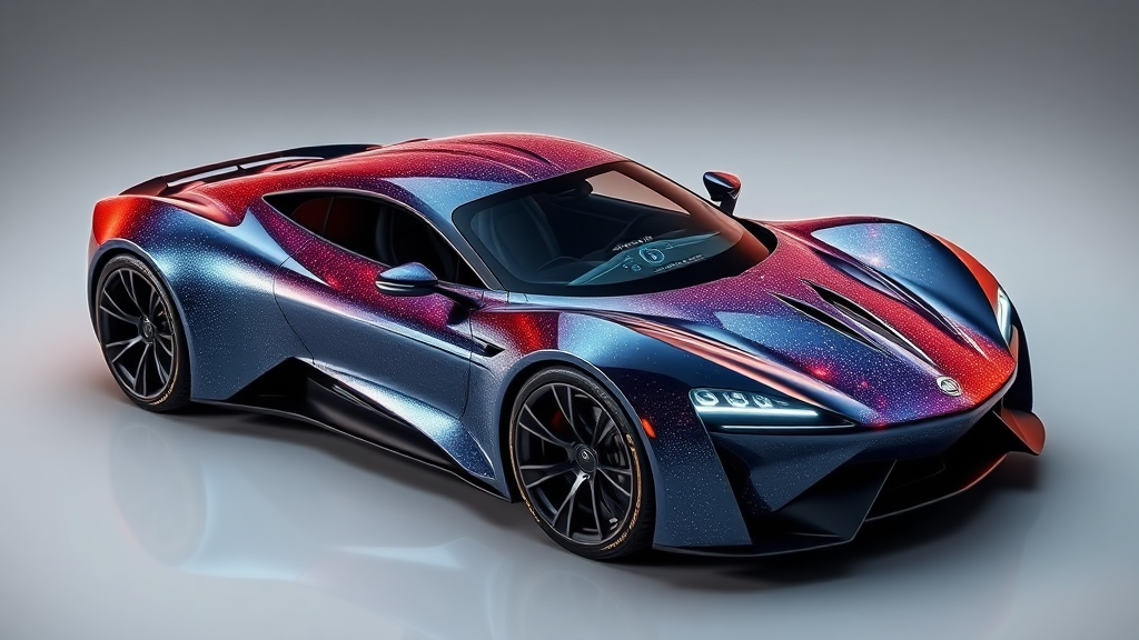 Galactic-inspired sports car with sleek aerodynamic design, shimmering metallic finish reflecting starlight hues, advanced anti-gravity propulsion system for seamless terrestrial and orbital travel, holographic dashboard displaying real-time cosmic data, and adaptive AI for personalized interstellar driving experience.