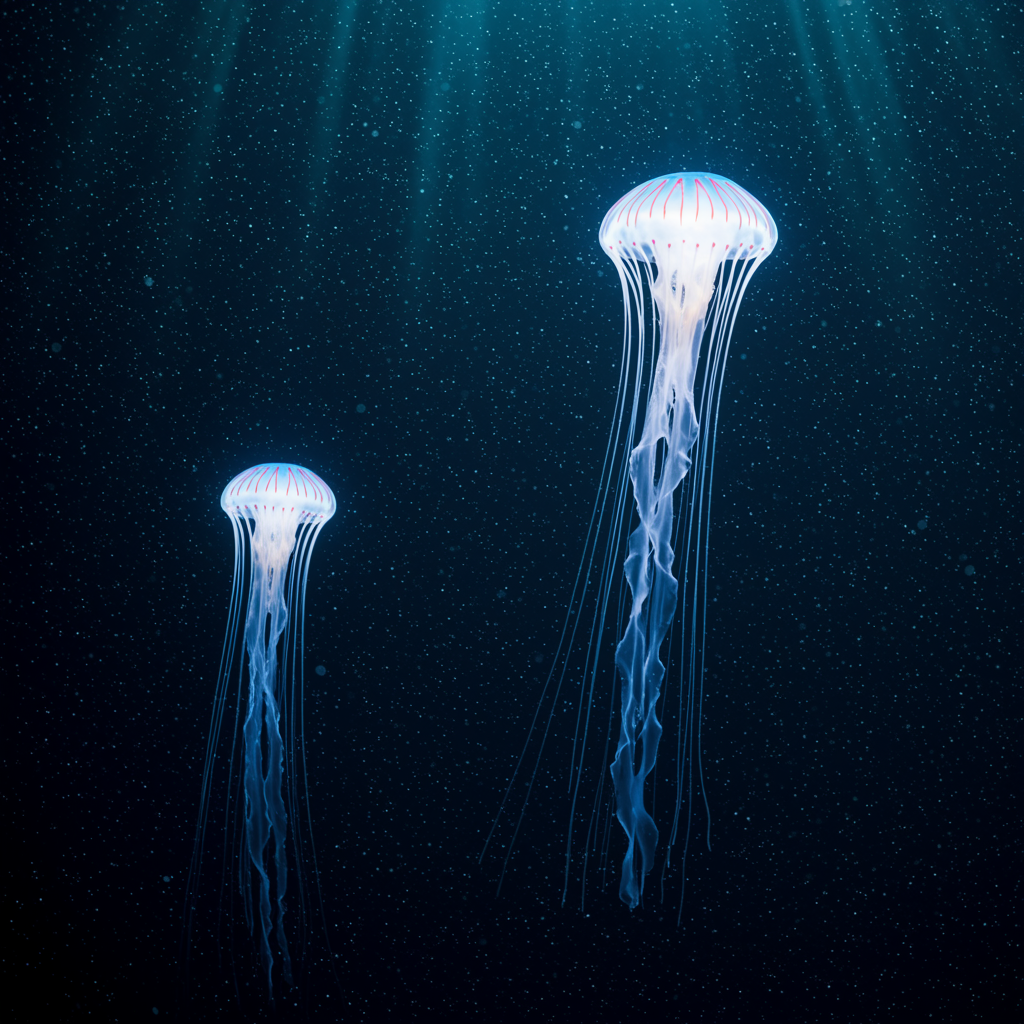 Galactic jellyfish drifting through an ethereal ocean, Sci-Fi essence, Enchanting luminescence, Divine beams, Suspended oceanic particles, shimmering bubbles, mystical ambiance, Deep-sea realm, Brilliant hues, Ultra high definition, High dynamic range, 8K resolution.