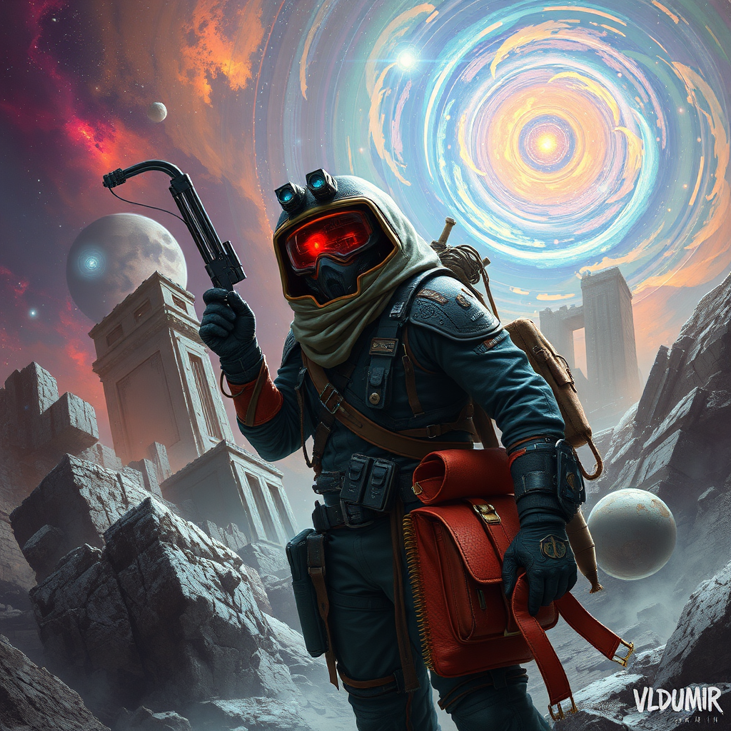 Galactic treasure hunter dressed in a fusion of cybergoth and rugged adventurer style, exploring ancient alien ruins amidst swirling nebulae, high-tech gadgets interlaced with traditional archaeology tools, deep space backdrop with vibrant hues and cosmic anomalies, capturing the spirit of exploration and mystery, evoking the artistic flair of Vladimir Matyukhin.