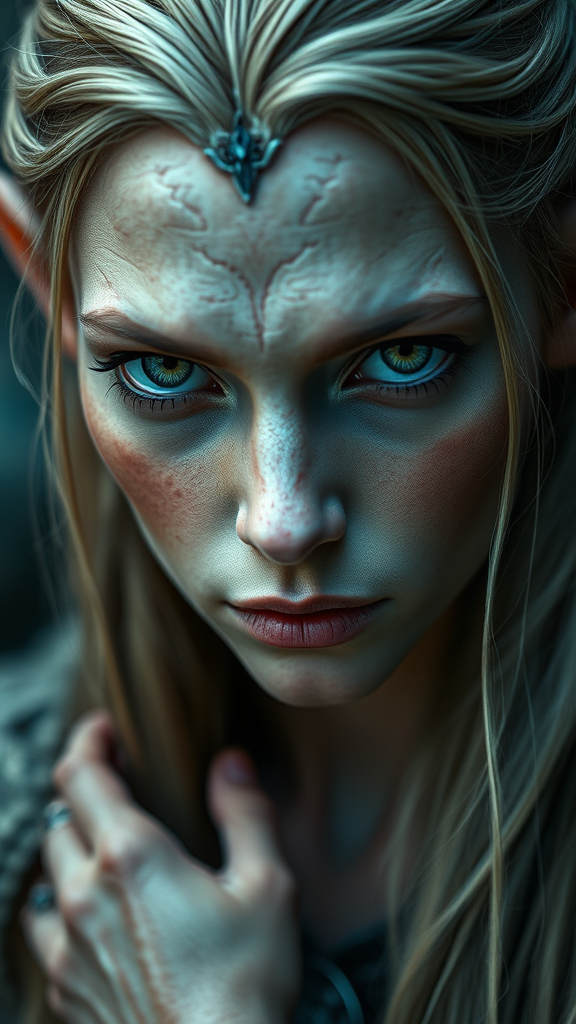 Galadriel-inspired elf, fantasy female, intriguing gaze at the viewer, portrait style, photography essence, intricate skin textures, realistic and photo-realistic detail, crisp 8k quality, richly detailed, full-body capture, high detail RAW color artistry, captivating expression, soft diffused lighting, shallow depth of field for focus, precise sharpness, hyperrealism, cinematic ambiance, low-res, text issues, cropping mishaps, subpar quality, jpeg flaws, unattractive aspects, duplication concerns, unsettling features, disfigurements, misalignment, blurred areas, dehydrated look, flawed anatomy, disproportionate elements, additional limbs, mirrored face, distorted proportions, malformed extremities, missing or extra limbs, fused digits, excessive fingers, elongated necks, username presence, watermark visibility, signature traces.