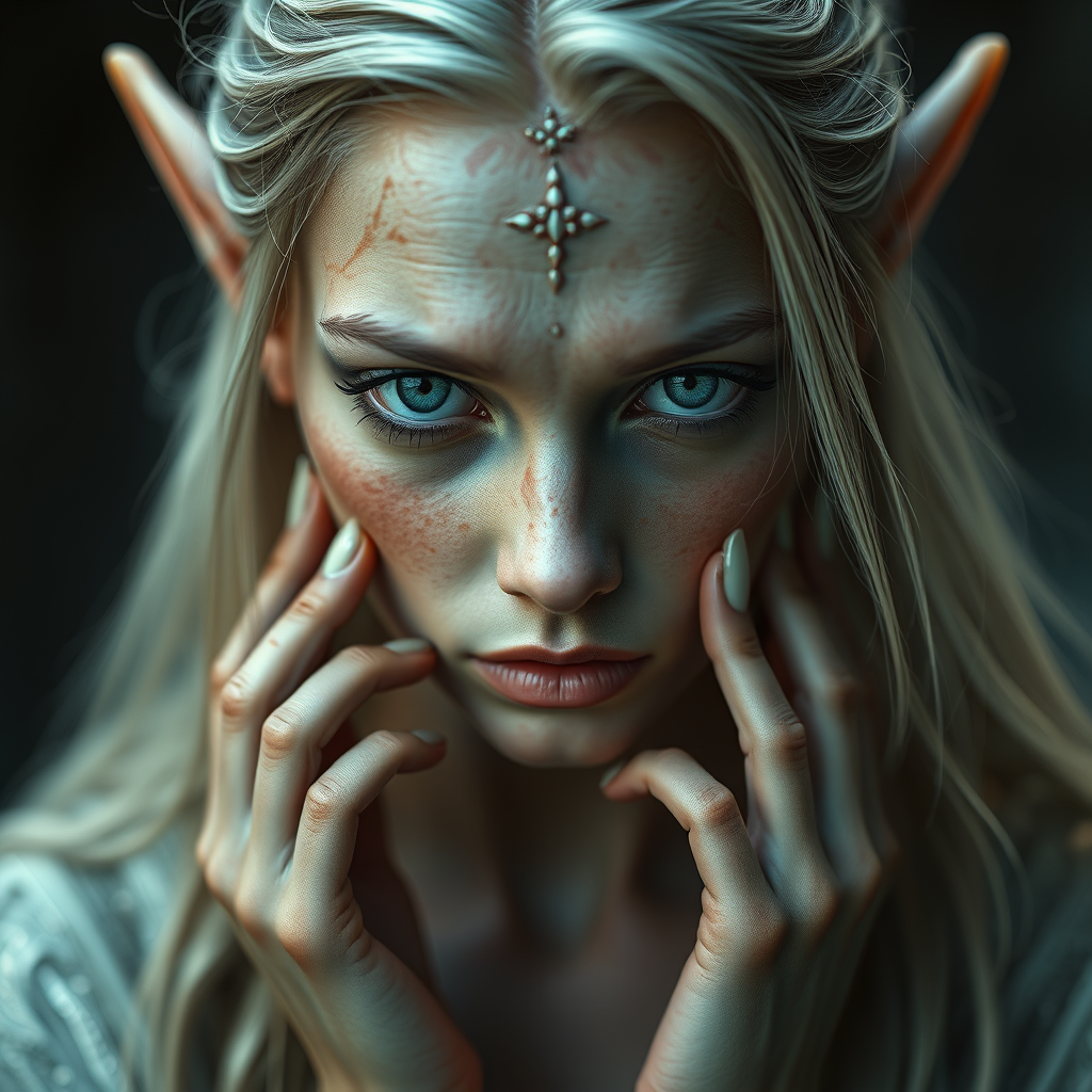 Galadriel-inspired, elven fantasy portrait, female elf, captivating gaze toward viewer, intricate and realistic skin texture, photo-realistic finish, 8k resolution, full-length depiction, high detail with vivid colors, ethereal soft lighting, shallow depth of field for sharp focus, hyperrealistic and cinematic illumination, avoiding any low-quality aspects or imperfections, ensuring an anatomically accurate and beautifully proportioned form, hands and face perfectly rendered, avoiding any distortions or unnatural features, gracefully crafted with artistic elegance.