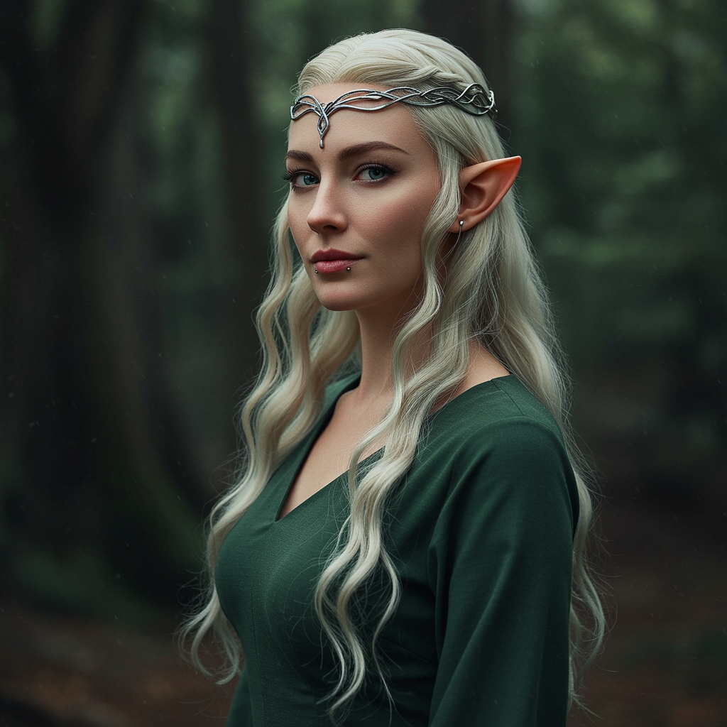 Galadriel-inspired, LOTR fantasy, elegant female elf, captivating gaze, realistic portrait photography, intricately detailed skin, ultra-realistic, high-resolution, full-length composition, vivid RAW color tones, striking piercings, soft diffused lighting, shallow depth focus, cinematic atmosphere, hyperrealistic texture. Dismiss qualities such as low-resolution, textual errors, digital artifacts, undesirable duplication, or distortions like distorted hands, improperly structured anatomy, blurred aspects, disproportionate features, or any additional and malformed limbs. Minimize flaws, exclusions of limbs, and unnatural extensions while retaining the essence of ethereal beauty.