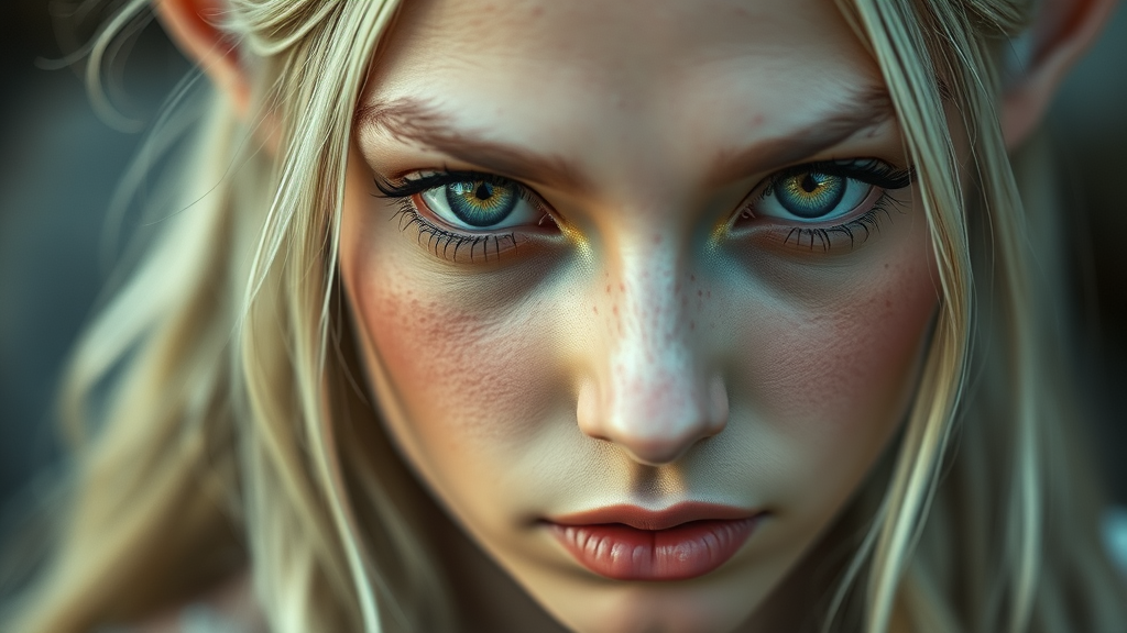 Galadriel-inspired portrait, enchanting elf, female, gazing directly with an intense expression, high-fantasy allure, intricate skin detail, ultra-realistic and vividly captured, full-framed composition, vibrant RAW color aesthetic, minimalistic piercing accents, soft cascading lighting, shallow focus creating an ethereal ambiance, hyper-realistic sharpness, cinematic quality, avoiding low resolution and common digital artifacts, ensuring natural anatomy with proportional grace, seamless lines, and lifelike features, avoiding distortions, embracing elegance and fantasy essence without distractions from undesired visual flaws.