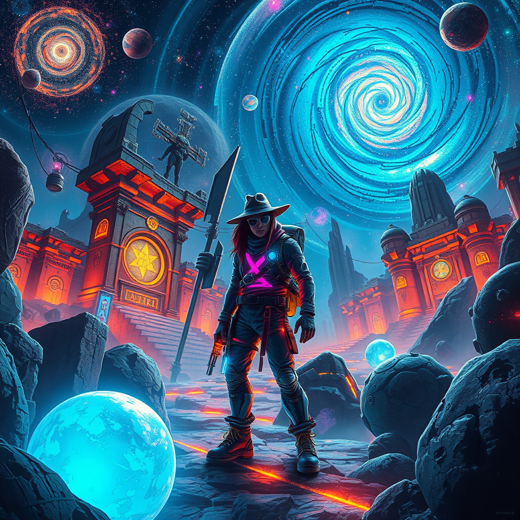 galaxy cyberpunk adventurer exploring ancient cosmic ruins surrounded by neon-lit celestial artifacts futuristic techno attire reminiscent of Indiana Jones set against a backdrop of swirling galaxies with vibrant colors designed in the style of Vladimir Matyukhin detailed and raw emphasizing an epic interstellar journey