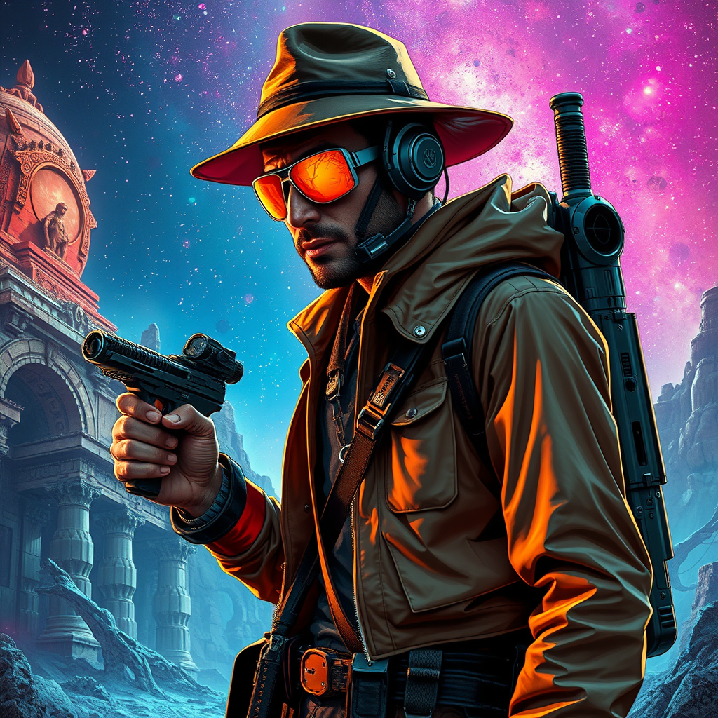 galaxy cyberpunk adventurer with a futuristic twist, exploring cosmic ruins in a neon-lit universe, inspired by Indiana Jones, designed by a visionary artist, showcasing intricate details of high-tech gadgets and sleek attire, against a backdrop of vivid starfields and ancient alien architecture, emphasizing a raw, dynamic style with elongated vertical composition