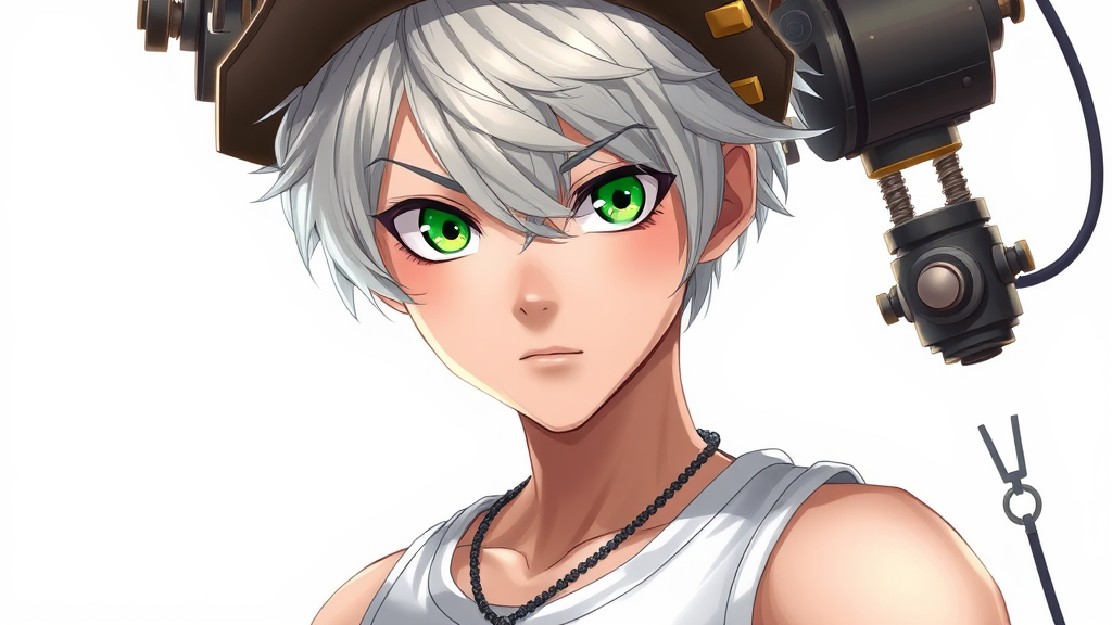 game 2d art, image of a young man with silvery gray hair, approximately 16 years old, vibrant green eyes, wearing a white tank top under steampunk-inspired attire, anime style, dynamic and expressive pose, highly detailed, plain white background, HD quality, artistic influences by Hideo Minaba, Yuya Nagai, Ryoji Ohara, Ryota Murayama, and Hitomi Yoshimura, reminiscent of Granblue Fantasy aesthetics, with a touch of whimsy and innovation.