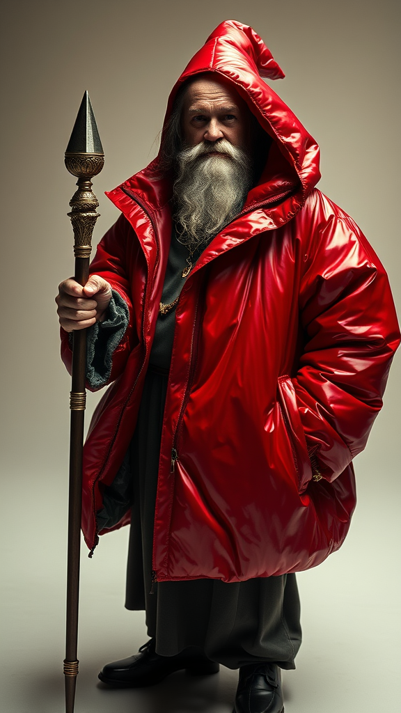 Gandalf, confidently holding a scepter, stands in a well-lit fashion shoot. He dons a metallic red inflatable oversized jacket, skillfully blending the distinctive styles of Yeezy and Balenciaga. The shot captures a sharp focus with intricate detail, exuding a cinematic and glamorous aura within a symmetrical composition. The soft, indirect lighting enhances the editorial and vogue-like quality of the scene. Despite being a full-body portrait, the emphasis is on clarity and precision, avoiding any imperfections or distortions. The image avoids artifacts and maintains a high-quality editorial feel, highlighting Gandalf's ageless charm amidst a modern and innovative fashion setting. Creative touches bring a fresh perspective to this intersection of fantasy and high fashion.