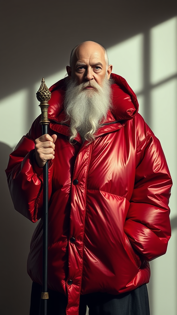 Gandalf holds a scepter, a well-lit portrait of him wearing a metallic red inflatable oversized jacket designed by Yeezy and Balenciaga, cinematic glamour, and symmetry, with intricate shadows and soft lighting, a Vogue-inspired editorial fashion photo with a focus on the jacket's details and Gandalf's regal presence, set against a simple, minimalist background to accentuate the outfit, the jacket's inflated silhouette adding drama and flair, with subtle texture and dimension, and a slight sense of movement as if Gandalf is about to stride into a scene, his expression a mix of wisdom and authority, the scepter held confidently in his hand, with a subtle hint of a smile, the overall mood one of confidence, power, and elegance, with a touch of whimsy and fantasy, the metallic red jacket a bold statement piece that steals the show, while Gandalf's iconic presence grounds the image in reality.