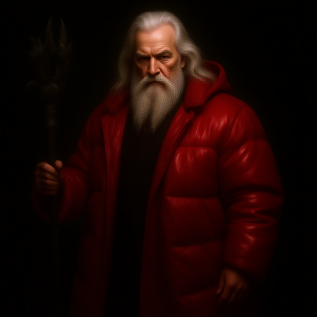 Gandalf stands confidently in a cinematic fashion shoot, holding a regal scepter. He's dressed in an eye-catching metallic red inflatable jacket, the latest creation from Yeezy and Balenciaga. The oversized garment wraps around his form, balancing mythical allure with modern high fashion. The lighting is soft yet dramatic, casting an elegant glow that emphasizes every intricate detail. His wise eyes and distinguished features are in sharp focus, capturing the glamour and sophistication of high-end editorial photography. The symmetry of the shot highlights his stature, blending fantasy and contemporary style, embodying a striking visual narrative without any distractions of imperfections or digital errors. This portrait could easily grace the pages of Vogue, merging the timeless power of Gandalf with avant-garde fashion brilliance.