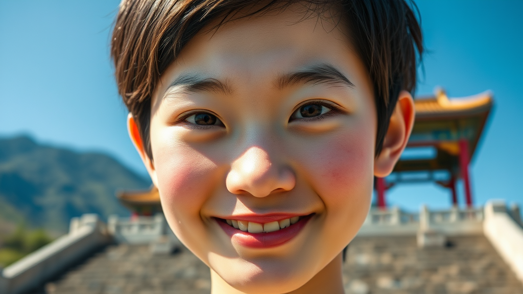 ganyudef, close-up portrait, cheerful expression, rosy cheeks, natural light, bright day, minimal background, clear blue sky, short hairstyle, serene outdoors, ancient structure, direct gaze, steps leading up, mountainous backdrop, atmospheric lighting, ultra-high definition, vivid colors, realistic, softly focused sky, twin-like resemblance, unique facial features, gentle eyes, elegant posture, natural hands, blended scenery, seamless composition, crisp quality, artifact-free, visually cohesive, subtle narrative elements.