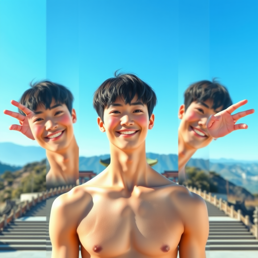 ganyudef, upper body, smile, blush, outdoors, daytime, clear background, azure sky, short hair, skyline, temple, direct gaze at viewer, steps, mountains, atmospheric lighting, high resolution, ultra-high definition, high dynamic range, duplicate elements, imaginative mutation, cloned faces, crossed eyes, elongated neck, additional fingers, altered hands, low resolution, out-of-frame elements, blur effect, digital artifacts, no text or symbols, close-cropped, animated style, divided images.