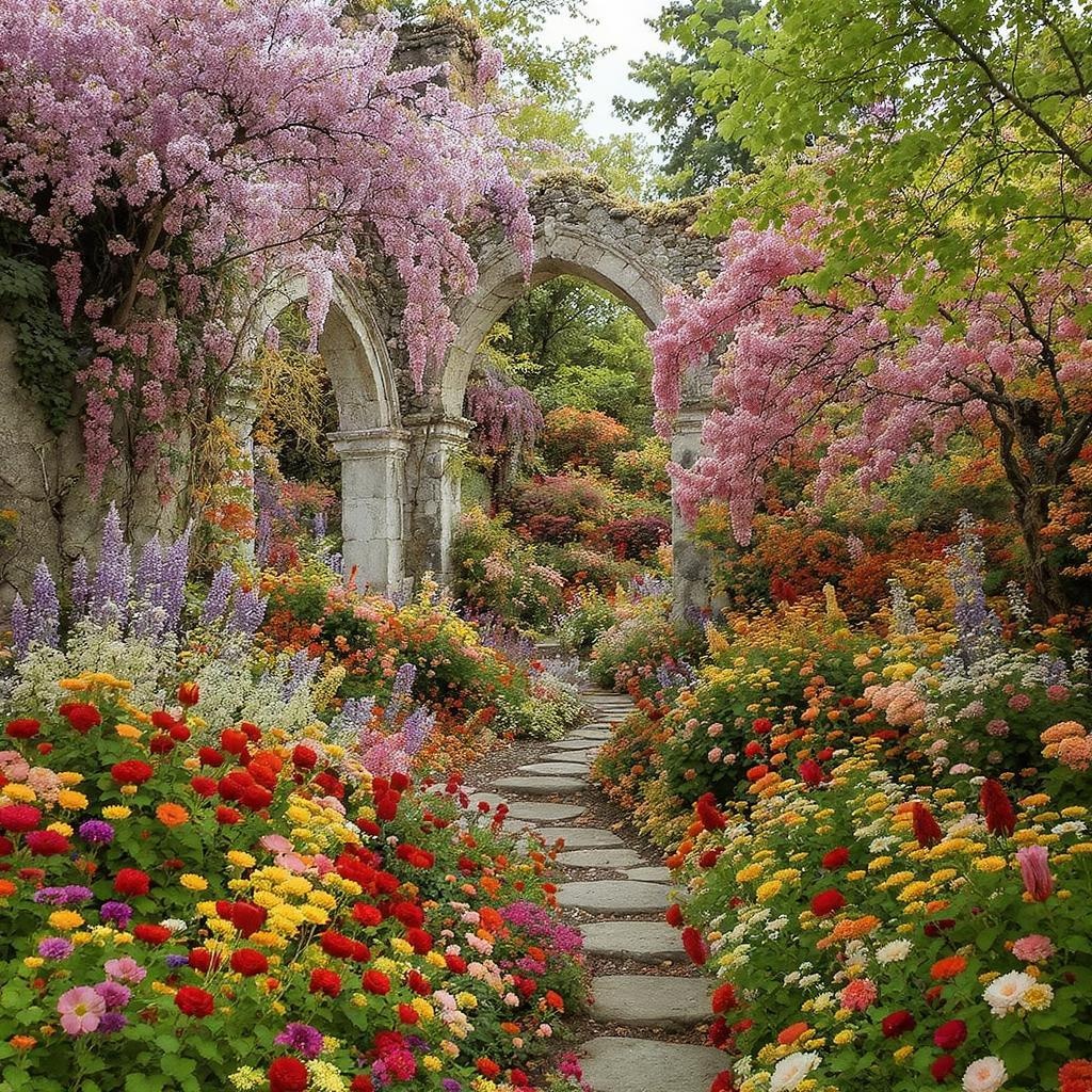 View this AI-generated image featuring a vibrant garden teeming with a kaleidoscope of flowers intertwined with ancient ruins capturing the essence of art inspired by paulina g ra and rachel ruysch where nature and history dance together in a symphony of color and decay delicate blossoms cascading o