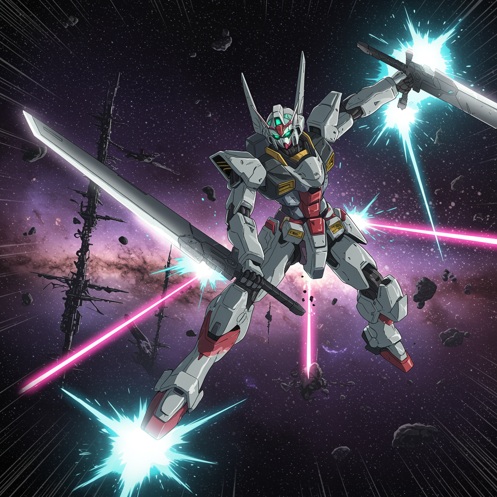 Gargantuan mech in the vast expanse of space, wielding enormous swords, inspired by Tsutomu Nihei's distinctive style in a scene reminiscent of Sidonia no Kishi; an anime spectacle showcasing towering structures amidst the cosmos, in a futuristic and sci-fi setting, the mech is in dynamic motion, engaged in combat, with intricate details capturing every element, including intense lasers piercing through the void, energy surges forming pulsating clots, rapid acceleration, dazzling flashes of light at breakneck speed, depicted in a first-person view, rendered in stunning 8K, HD, with super-resolution clarity, merging manga-inspired graphics with epic, high-octane action.
