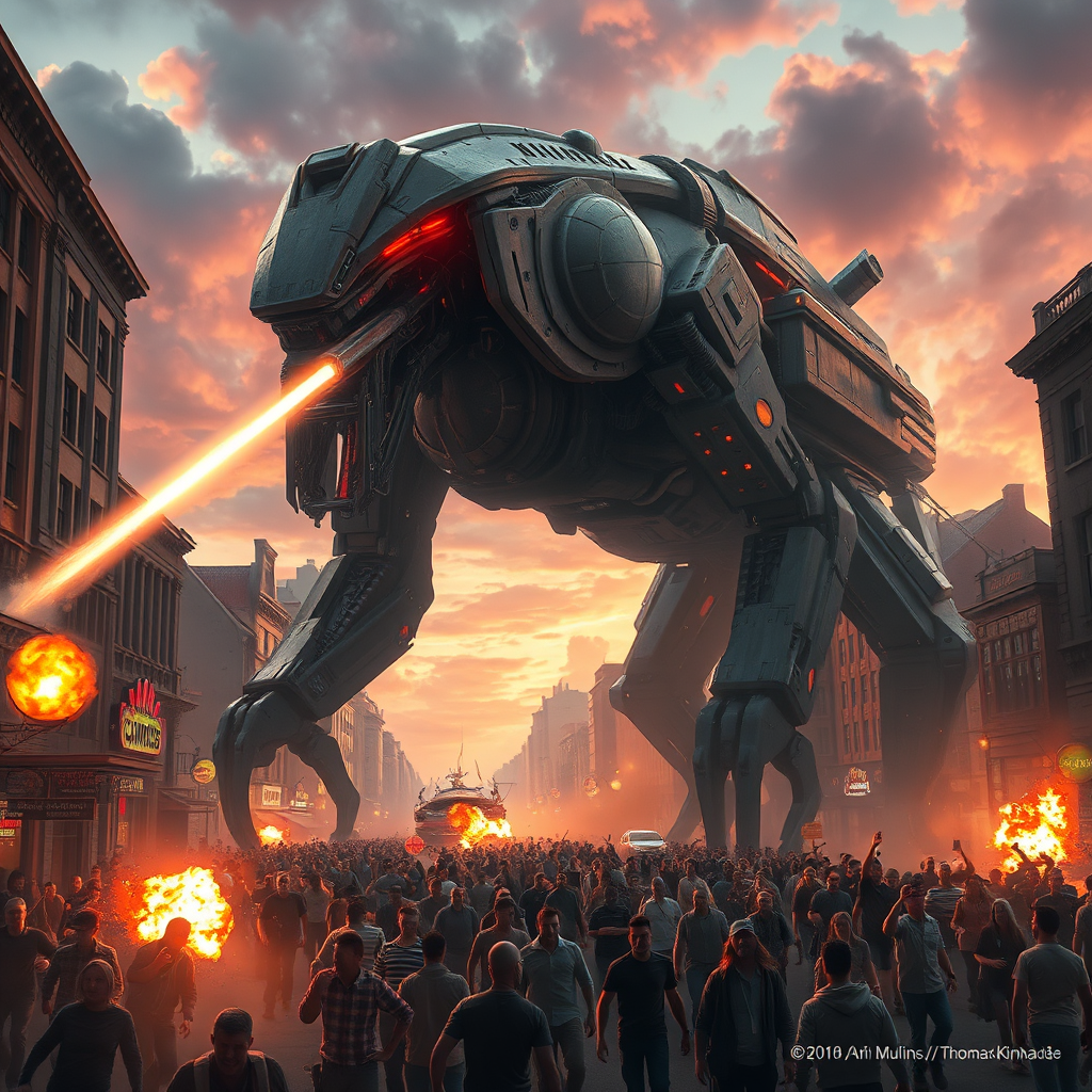 Gargantuan mechanical behemoth with a foreboding futuristic design unleashes a colossal laser beam from its head onto a frantic crowd of screaming, terrified people scrambling through a bustling city street at dusk, amidst chaos, explosions, and clouds of dust and smoke, evoking a war of the worlds scene. Rendered in cinematic hyper-realism with intricate details, octane lighting accentuates vibrant colors, smooth gradients, and stark contrasts. Artistic inspiration drawn from Craig Mullins and Thomas Kinkade styles, with text watermark and artist signature denoting copyright ownership.