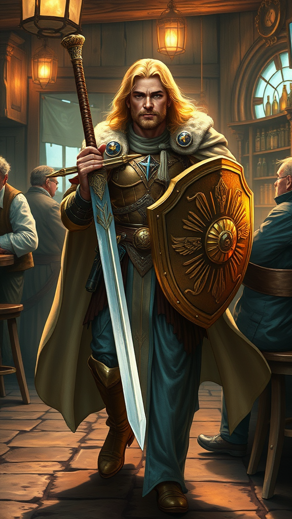 Gavriel, a noble and courageous aasimar paladin, radiates a divine energy with every step. His golden hair and sapphire-like eyes reflect his celestial origins. Armed with a magnificent sword emblazoned with a sunburst and a shield decorated with angelic symbols, Gavriel is a protector of the innocent, vanquishing evil with unwavering faith. As he approached the tavern, his footsteps resonated like a distant church bell, capturing the attention of all present. The bartender, a weathered man with a troubled past, leaned in, drawn to Gavriel's divine aura. Cinematic, dramatic, centered masterpiece.