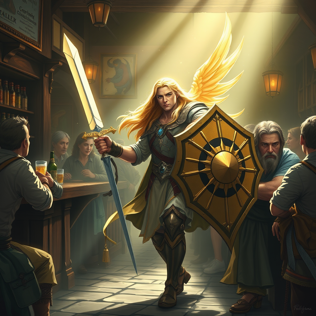 Gavriel, a noble and valiant aasimar paladin, is graced with divine powers and a radiant aura reminiscent of sunlight. His flowing golden hair and eyes gleaming like sapphires hint at his celestial origins. He commands a magnificent sword emblazoned with a sunburst and carries a shield adorned with angelic symbols, defending the innocent and vanquishing the wicked with resolute conviction. As Gavriel approached the bar, his footsteps resonated like a distant bell ringing through a cathedral, capturing the patrons' silent attention. The bartender, a weathered man with a forlorn look, leaned forward, drawn to Gavriel's divine presence in search of comfort. His stance and aura transform the encounter into a cinematic masterpiece, with each detail emphasizing the drama and momentousness of his arrival.
