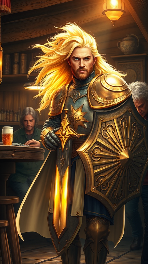 Gavriel, a noble and valiant aasimar paladin, radiated divine power and a luminous aura as bright as the midday sun. His flowing golden hair and sapphire-like eyes bespoke his celestial lineage. Clad in armor that gleamed with ethereal light, he wielded a magnificent sword bearing a sunburst motif, paired with a shield emblazoned with angelic runes. Gavriel was a formidable guardian of the innocent and a relentless foe to evil, driven by an unyielding sense of justice. As he entered the tavern, his presence silenced the room, his footsteps resonating like the solemn chime of a cathedral bell. The bartender, a weathered soul with a troubled past reflected in his eyes, leaned forward, yearning for the comfort of Gavriel's divine aura. This scene unfolded in a setting captured with a cinematic focus, evoking dramatic imagery worthy of a masterpiece.
