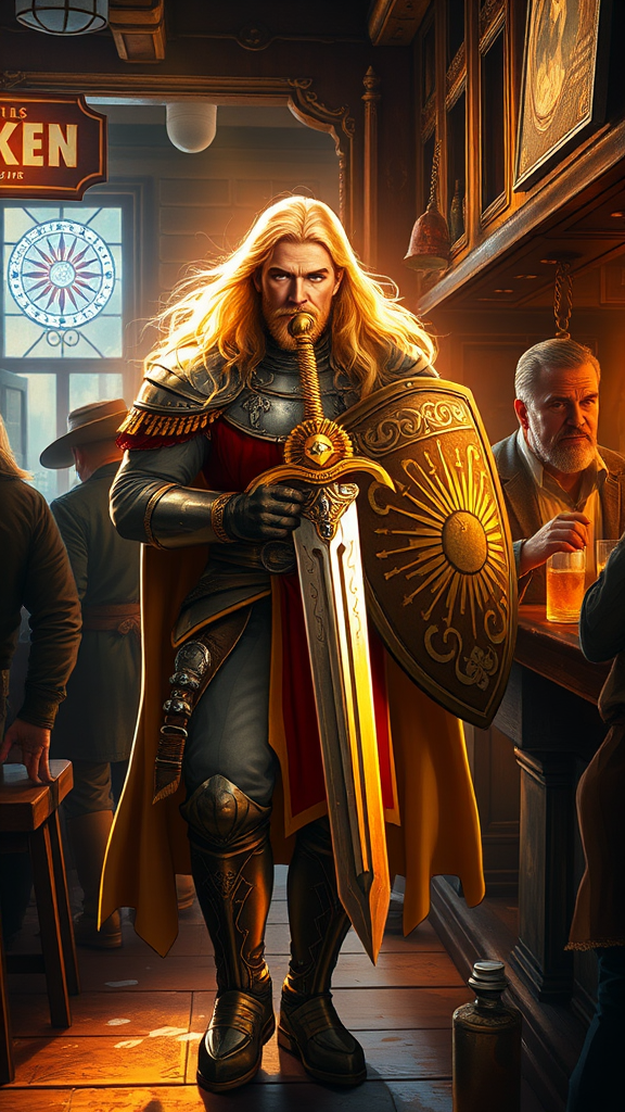 Gavriel, a noble and valiant aasimar paladin, radiates an aura that shines like the sun, reflecting his divine blessing. His luminous golden hair and sapphire-like eyes are testament to his celestial lineage. Armed with a magnificent sword emblazoned with a sunburst and a shield adorned with angelic symbols, Gavriel stands as a defender of the innocent and a smiter of the wicked, driven by unwavering conviction. As he approached the bar, his footsteps resonated with the solemnity of a distant church bell, drawing the silent attention of the patrons. The bartender, a grizzled figure with a troubled gaze, leaned in, perhaps seeking solace in Gavriel’s calming presence. Cinematic shot, vignette, centered, dramatic, masterpiece.