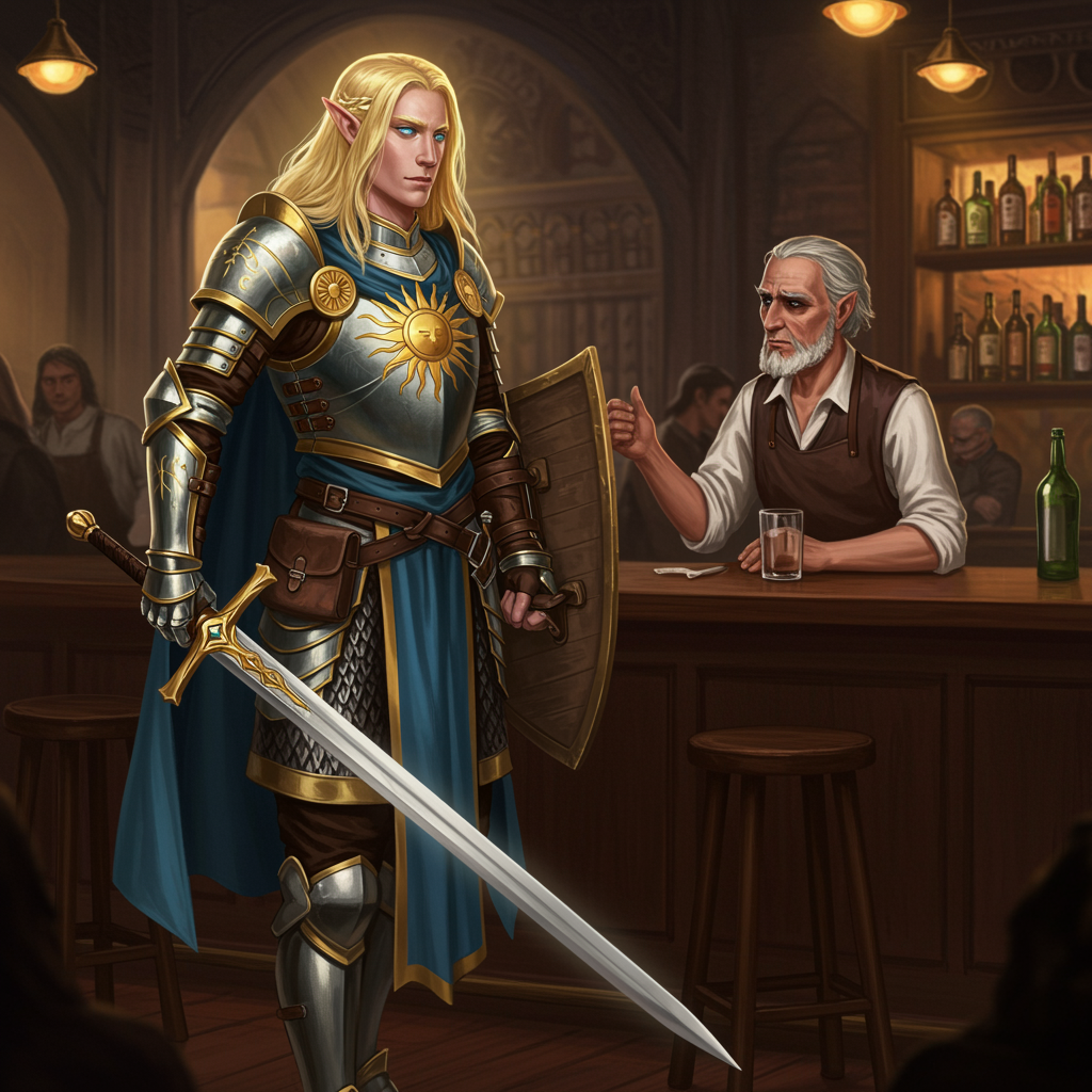 Gavriel, a noble and valiant aasimar paladin, radiates divine energy, his aura bright as the midday sun. His golden hair flows like liquid light, and his sapphire eyes reveal a celestial lineage. Wielding a magnificent sword emblazoned with a sunburst and a shield marked with sacred symbols, Gavriel stands as the protector of the innocent and the bane of the malevolent, guided by his unwavering convictions. As he stepped into the bar, the resonance of his footsteps was like the toll of a distant church bell, capturing the attention of all. The bartender, an aged man with eyes shadowed by past sorrows, leaned in, drawn to the serene comfort of Gavriel's presence. cinematic, vignette, centered, dramatic, masterpiece.
