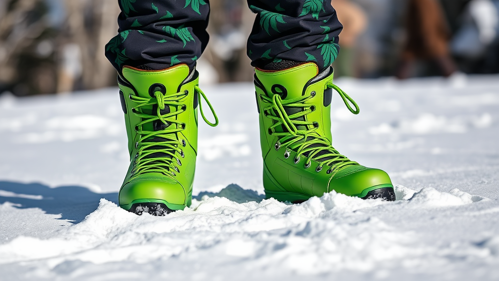 gazing at feet, vibrant green leather snowboard boots with matching green laces, dark and green patterned snowboard pants, standing on fresh snow
