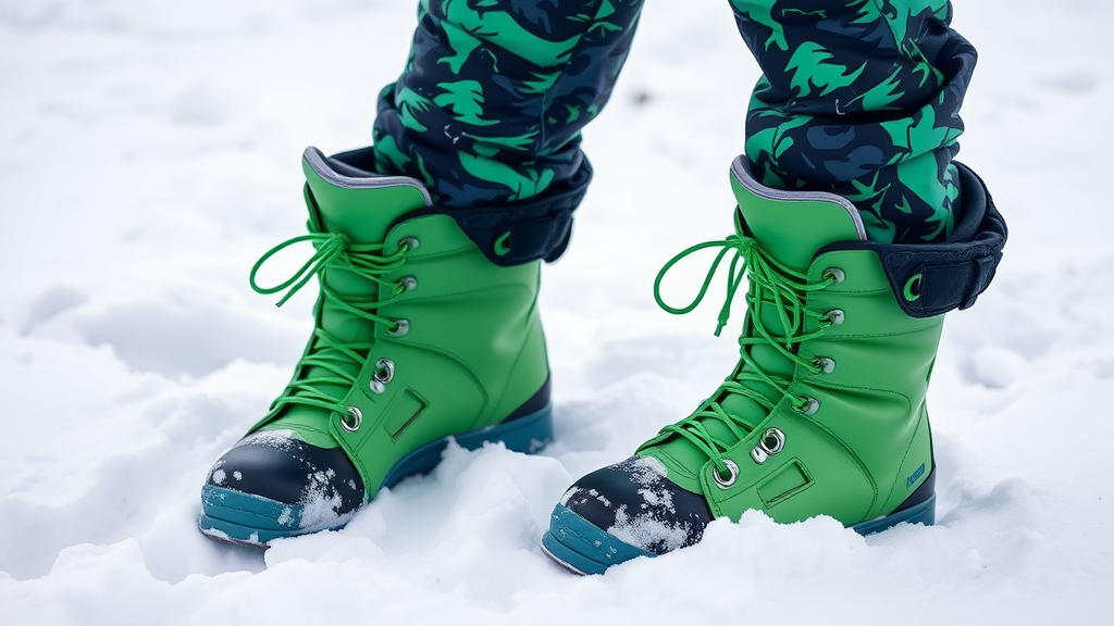 Gazing at my feet clad in vibrant green leather snowboard boots, each laced up with bright emerald strings, I stand anchored in the fresh snow. My black and green patterned snowboard pants ripple gently with the crisp mountain breeze, blending seamlessly into the crisp white landscape surrounding me.