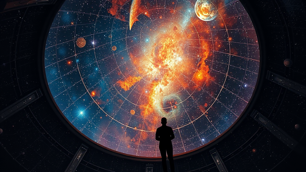 Gazing at the celestial dome, immersed in reflection and awe, endless universe, swirling with ethereal luminescence, centered, intricately detailed, breathtaking allure, precise linework, vibrant hues, comprehensive cinematic style, inspired by Kelly McKernan, 8k resolution, HDR, premium quality, high-resolution, digital art. Avoid low-resolution, text errors, or anatomical mistakes. Maintain focus on beauty without text, signatures, or distortions, ensuring clarity and elegance throughout.