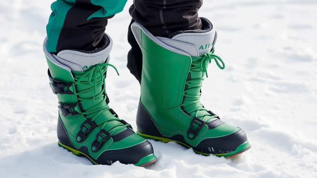 Gazing at vibrant green leather snowboard boots with matching laces, paired with sleek black and emerald snowboard pants, standing confidently on a blanket of fresh snow.