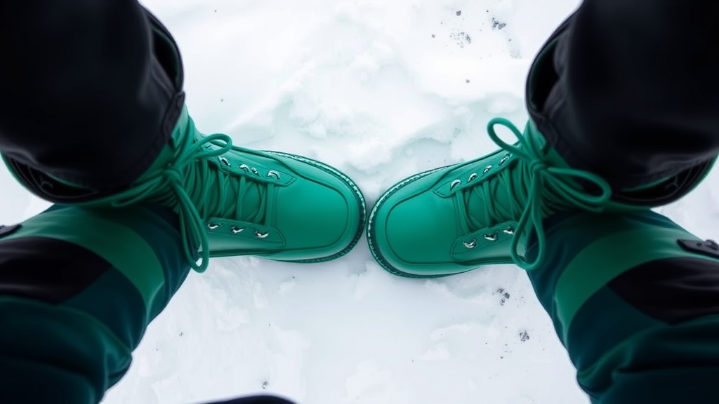 Gazing down at a pair of vibrant emerald leather snowboard boots tied with matching jade laces, accompanied by sleek snowboard pants blending black and forest green hues, all set against a backdrop of pristine white snow.