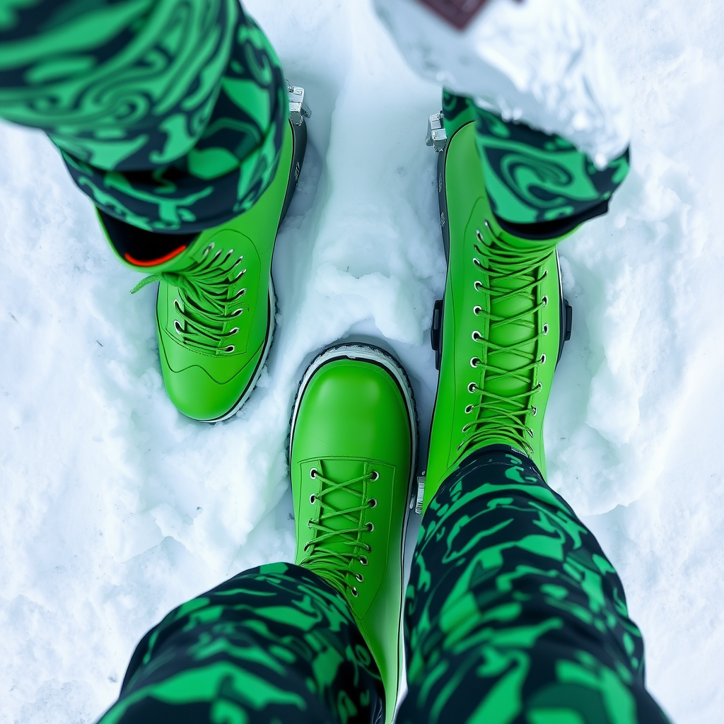 Gazing down at striking green leather snowboard boots with matching green laces, paired with dynamic black and green patterned snowboard trousers, surrounded by a pristine blanket of snow.