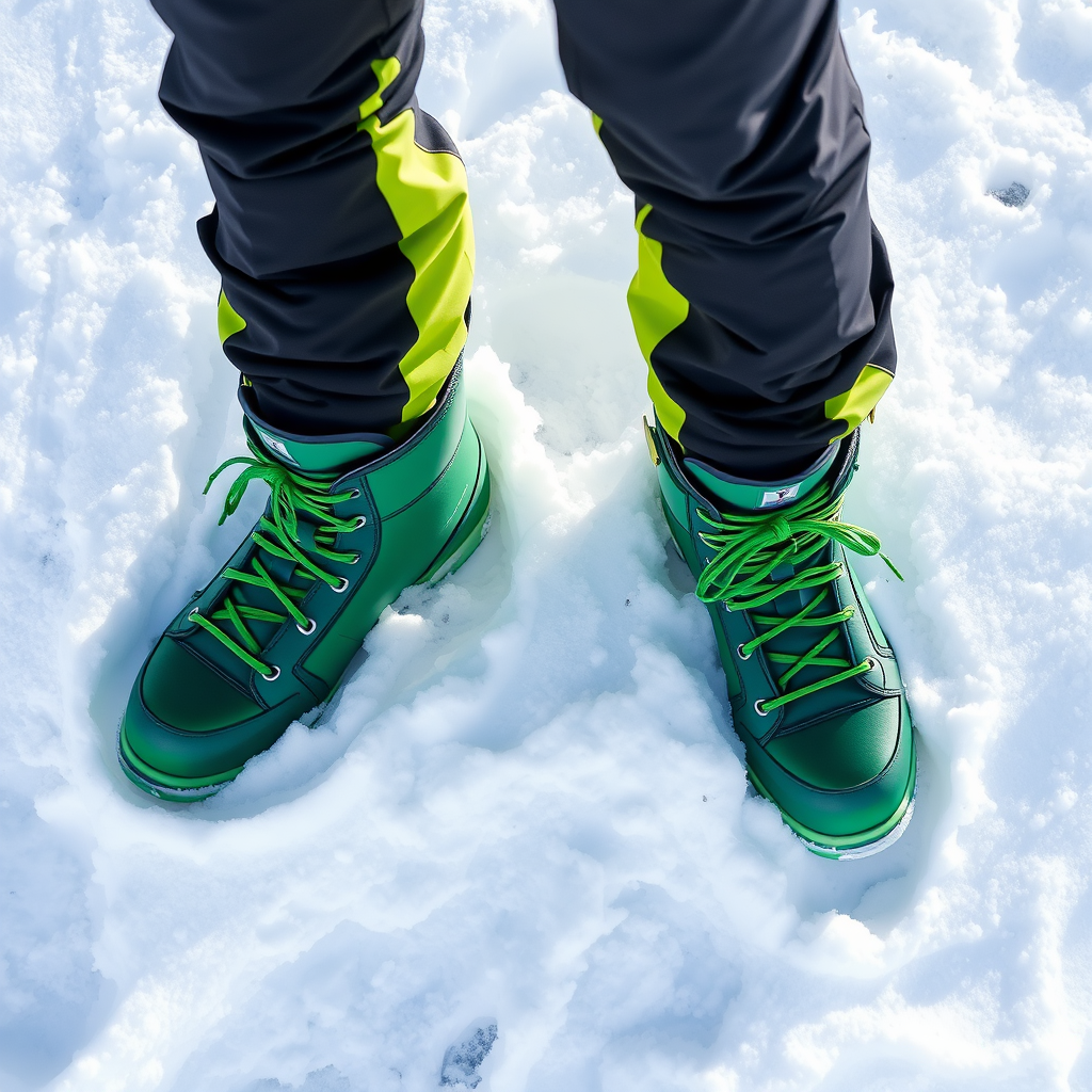Gazing down at the vibrant ensemble, emerald leather snowboard boots with forest green laces stand firmly in the powdery white snow, while the sleek black and lime-hued snowboard pants ripple with the mountain breeze.