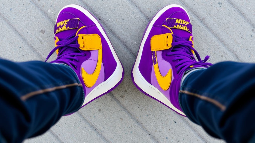 Gazing down at vibrant footwear, royal purple suede melds with bright yellow accents on a pair of Nike Dunk Highs, contrasting with artfully faded jeans.
